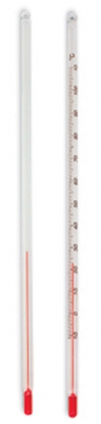 Glasthermometer mit Öse, Skala weiß unterlegt, rote Spezialfüllung.