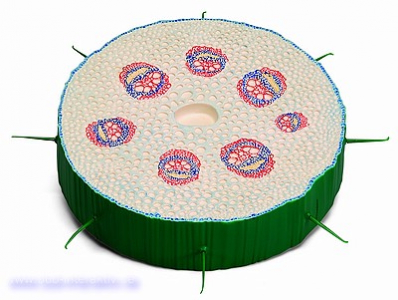 Das Modell zeigt den typischen Aufbau des Stängels einer zweikeimblättrigen Pflanze in 250-facher Größe.