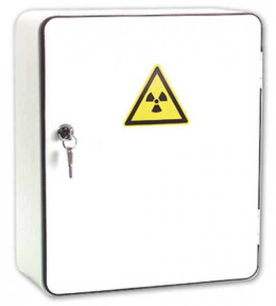 Stahlschrank für radioaktive Präparate zur diebstahlsicheren Aufbewahrung von Schulpräparaten gemäß Strahlenschutzverordnung.