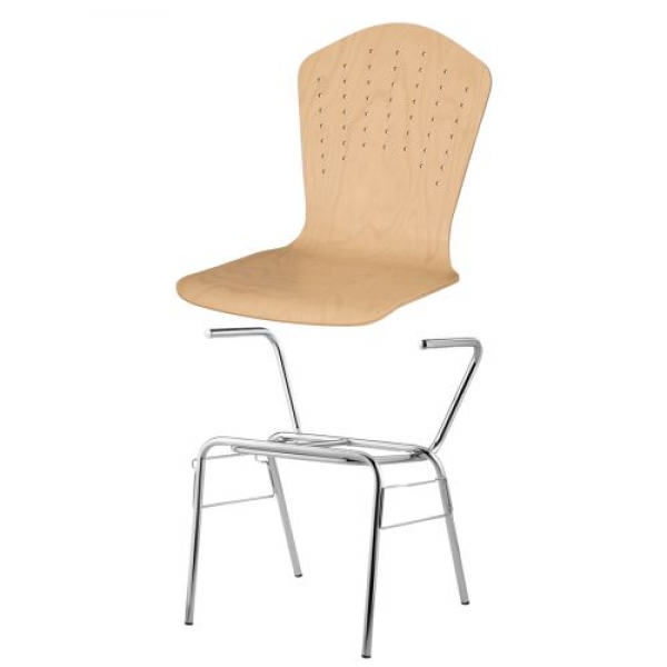 Der stapelbare Schalenstuhl mit Sitzschale "London" kann mit Rundrohrgestellen in unterschiedlichen Bauformen, mit und ohne Armlehnen und / oder Reihenverbindung bestellt werden. Die Sitzschale besteht aus mehrfach verleimtem formgepreßtem Bucheschichtholz und ist ergonomisch gearbeitet, natur lackiert.