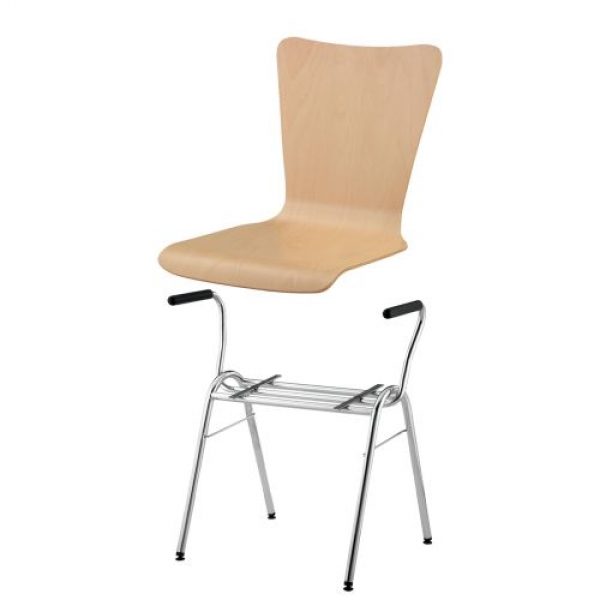 Der stapelbare Schalenstuhl mit Sitzschale "Madrid" kann mit Rundrohrgestellen in unterschiedlichen Bauformen, mit und ohne Armlehnen und / oder Reihenverbindung bestellt werden. Die Sitzschale besteht aus mehrfach verleimtem formgepreßtem Bucheschichtholz und ist ergonomisch gearbeitet, natur lackiert.