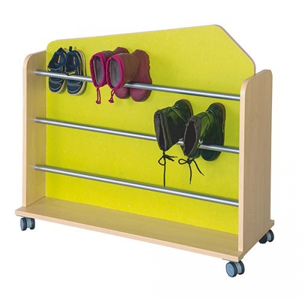 Auf dem doppelseitigen Stiefelwagen wird das Stiefel-Equipment der Kleinen übersichtlich und fahrbar aufbewahrt. Die platzsparende beidseitige Stiefelaufbewahrung in den Maßen B/H/T: 95x88x40 cm bietet hinter je 3 pulverbeschichteten Aluminiumrohren Platz für etwa 25 bis 30 Paar Stiefel. Natürlich kann auch anderes hohes Schuhwerk auf dem Stiefelwagen zum Trocknen aufbewahrt werden. Die formschön gestaltete Rückwand ist beidseitig mit kratz- und wasserfesten Linoleumoberflächen ausgeführt. Der Stiefelwagen ist auf 4 Doppelrollen, davon 2 Stück mit Feststellern, zuverlässig und sicher unterwegs. Das Korpusdekor ist durch die B1-Ausführung mit Buche festgelegt, die Linoleumfarbe ist jedoch wählbar!