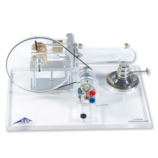Mit Umschaltmöglichkeit zum Betrieb einer eingebauten Lampe sowie zum Betrieb externer Lasten oder zur Einspeisung elektrischer Energie zum Betrieb als Wärmepumpe oder Kältemaschine je nach Drehrichtung des Stirlingmotors. Einschließlich Alkohol-Brenner (U10051).