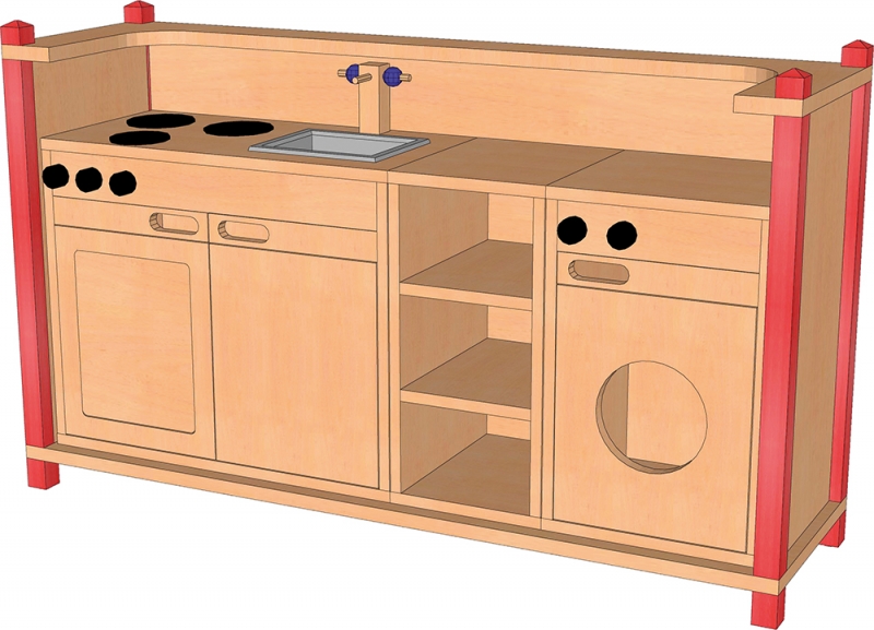 Stollenmöbel sind robust und daher für den Krippebreich hervorragend geeignet. Die Kinder haben eine Waschmaschine, einen Herd und eine Spüle. Ausserdem einen Schrank mit Doppeltüren und ein offenes Regal mit viel Platz und Stauraum.