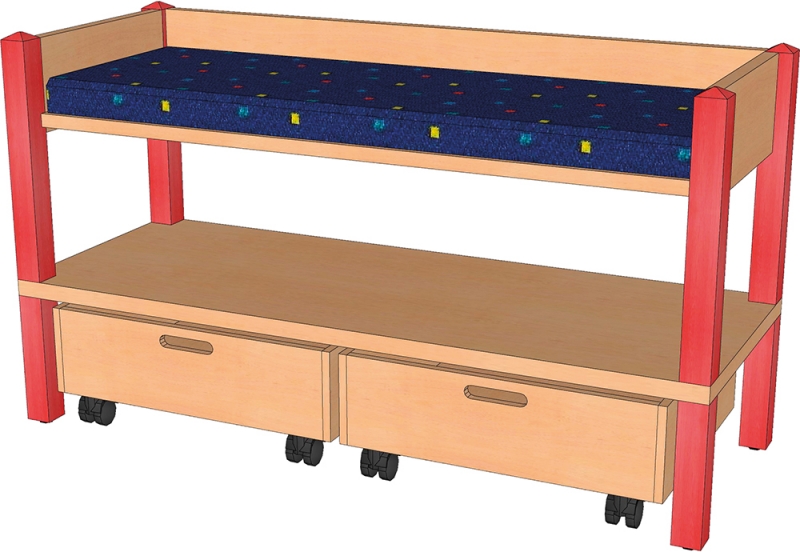 Stollenmöbel sind robust und daher für den Krippebreich hervorragend geeignet. Der Wickelplatz hat eine mit Stoff bezogene Auflage. Ein zusätzlicher Regalboden unter der Ablage bietet weiteren Platz und Stauraum. Die Sockelnische ist zusätzlich mit 2 Massivholzkästen auf Rollen bestückt.