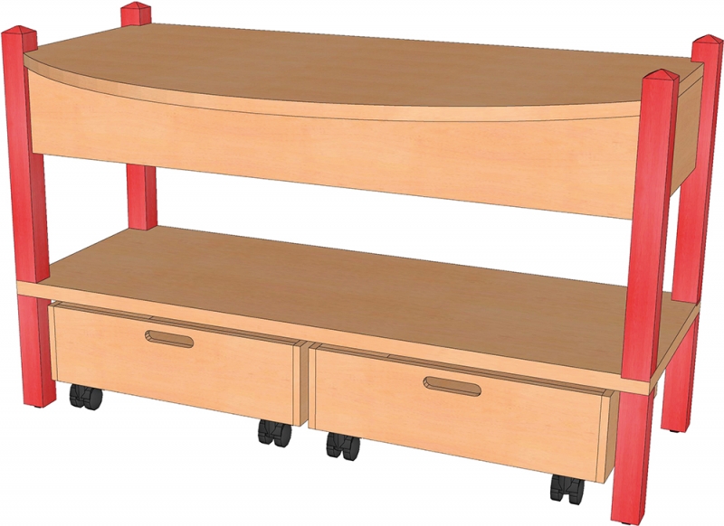 Stollenmöbel sind robust und daher für den Krippebreich hervorragend geeignet. Eine Tischseite wurde abgerundet. Die Sockelnische ist zusätzlich mit 2 Massivholzkästen auf Rollen bestückt.