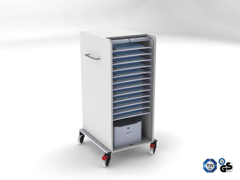Als sichere Aufbewahrungsmöglichkeit von Schüler-Notebooks und als Ergänzung zu allen anderen Systemen ist die „storage box light“ SBL-12 die Einsteigervariante für den computergestützten Unterricht. Der funktionale Rollschrank bietet standardmäßig Platz für bis zu 12 Notebooks, auf robusten Metallauszügen. Durch die Verwendung von RJ-45-Netzwerkanschlüssen und einem Switch, ist eine Fernwartung der Notebooks möglich. Mit dem optionalen Dockingstationen lassen sich die Notebooks besonders einfach aufbewahren und aufladen.