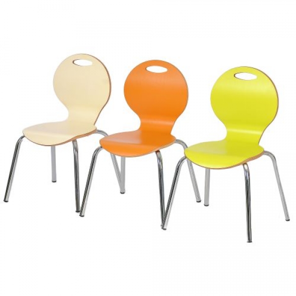 Gestell aus verchromtem Rundrohr, Sitzschale aus Buche-Sperrholz, Oberfläche Farbig, Sitzhöhe 46 cm