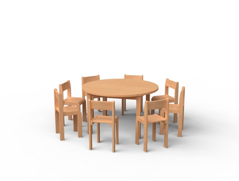 Stuhl & Tischset Nr. 3 bestehend aus:8xKiGa Stühlen ohne Armlehne Gestell: Buche natur, lackiert 1xRundtisch d= 100 cm 4-Fußgestell aus Quadratstollenmit gerader ZargeHPL Platte mit Buche EinleimerGestell: Buche natur, lackiert
