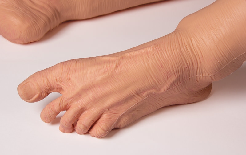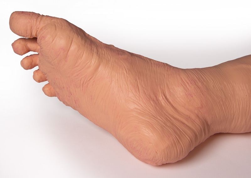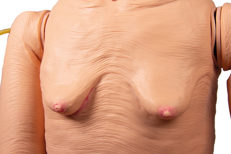 Verbesserte Ästhetik: weiche Silikonhaut mit erkennbaren normalen und kanzerösen Muttermalen, sakraler Dekubitus Stufe 1, gerötete Hautfalten.