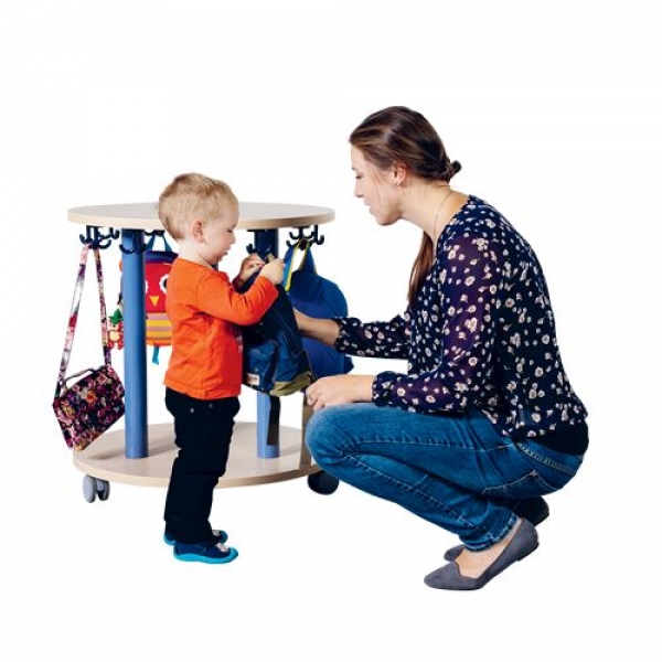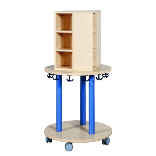 Der runde Taschenwagen aus feuerhemmendem B1-Material mit Buche-Dekor mit Ablagemöglichkeiten auf 360° bietet zwischen 3 stabilen Stützrohren Stauraum für Rucksäcke, Taschen und Mützen und Fahrradhelme und und und ... andere persönliche Utensilien! Dabei kann selbst die Garderobe der Kleinen direkt darüber hängen. Der Durchmesser des Taschenwagens beträgt 70 cm. Er ist auf 5 Doppelrollen, davon 2 Stück mit Feststellern, zuverlässig und sicher unterwegs. Die Farbe der Stahlteile ist wählbar.
