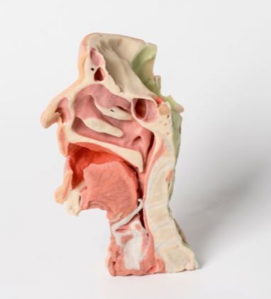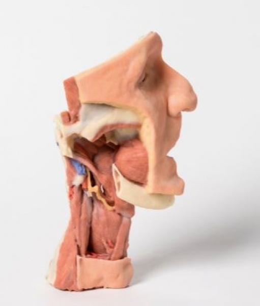 In diesem 3D gedruckten Präparat einer mittelsagittal geschnittenen rechten Gesichts- und Halshälfte wurden Ramus, Processus coronoideus mandibulae und Mandibulakopf entfernt, um den tiefen Teil der Fossa infratemporalis freizulegen.