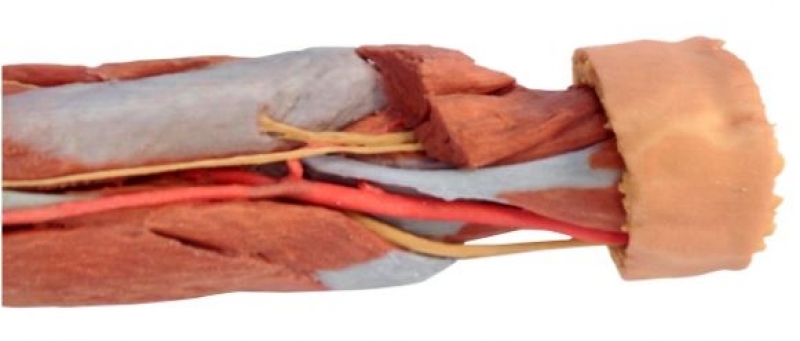 Dieses 3D-gedruckte oberflächliche Präparat einer echten oberen Extremität zeigt eine Mischung der vaskulären, nervalen und muskulären Anatomie des distalen Arms, des Unterarms und der Hand.