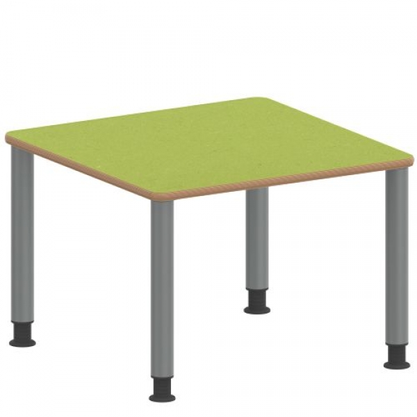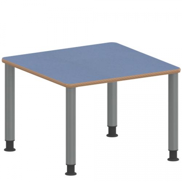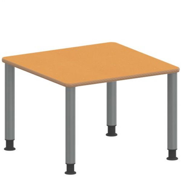 Quadratische Tischplatte: 60 x 60 cm, Tischhöhe 41 cm, Tischbeine aus Stahlrohr Ø 60 mm. Sie besitzen eine pulverbeschichtete Oberfläche in RAL 9006. Der Tisch ist mit der Tischfußvariante ''manuell höheneinstellbar bis +14 cm '' ausgestattet.