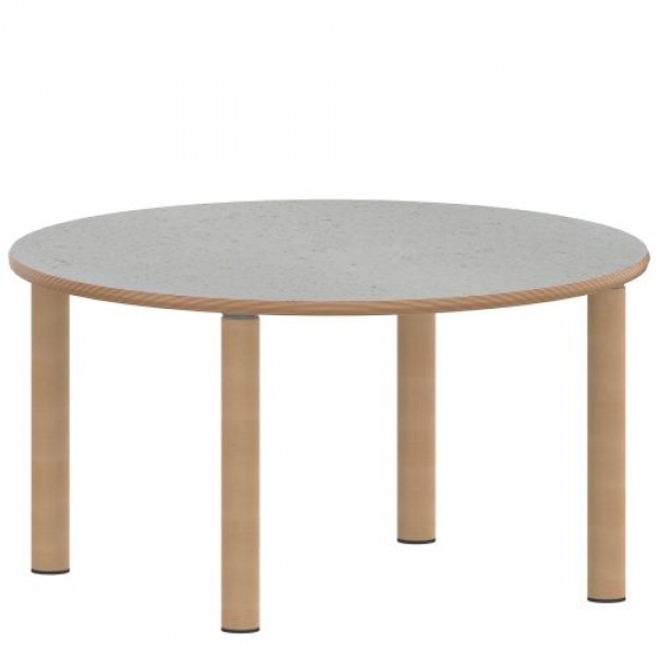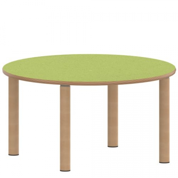 Kreisrunde Tischplatte: Ø 100 cm, Tischhöhe 41 cm, Tischbeine aus Massivholz Ø 60 mm. Die Holzoberfläche ist mehrfach lackiert. Der Tisch ist mit der Tischfußvariante ''Stellfuß'' ausgestattet.