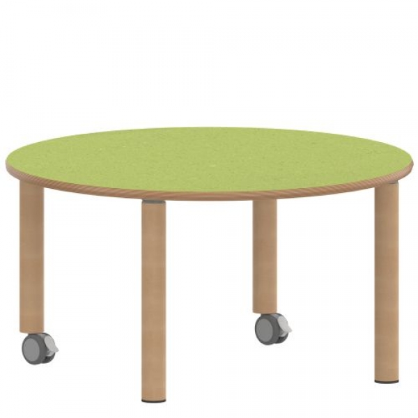 Kreisrunde Tischplatte: Ø 100 cm, Tischhöhe 41 cm, Tischbeine aus Massivholz Ø 60 mm. Die Holzoberfläche ist mehrfach lackiert. Der Tisch ist mit der Tischfußvariante ''fahrbar'' ausgestattet.