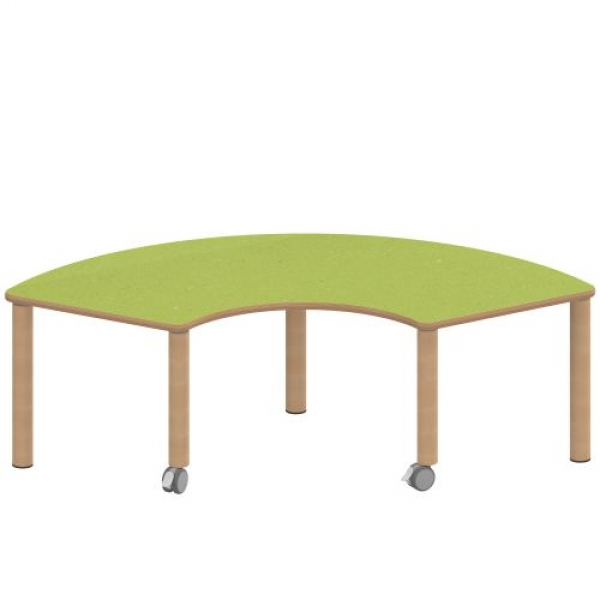 Drittelkreisförmige Tischplatte: 173 x 80 cm, Tischhöhe 41 cm, Tischbeine aus Massivholz Ø 60 mm. Die Holzoberfläche ist mehrfach lackiert. Der Tisch ist mit der Tischfußvariante ''fahrbar'' ausgestattet. Der Drittelkreis-Tisch mit dem Außendurchmesser 200 cm und Innen-Ø 80 cm steht auf 5 Beinen. Für die Planung von Stellkombinationen: die 2 geraden Anstellseiten sind je 60 cm lang.