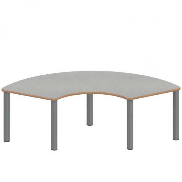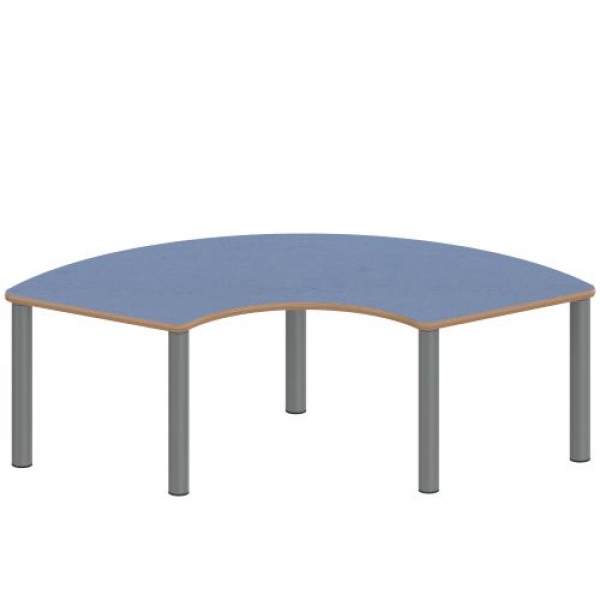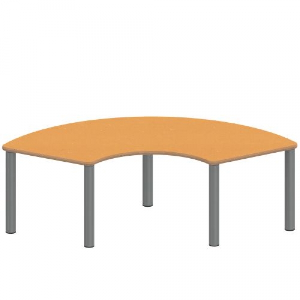 Drittelkreisförmige Tischplatte: 173 x 80 cm, Tischhöhe 41 cm, Tischbeine aus Stahlrohr Ø 60 mm. Sie besitzen eine pulverbeschichtete Oberfläche in RAL 9006. Der Tisch ist mit der Tischfußvariante ''Stellfuß'' ausgestattet. Der Drittelkreis-Tisch mit dem Außendurchmesser 200 cm und Innen-Ø 80 cm steht auf 5 Beinen. Für die Planung von Stellkombinationen: die 2 geraden Anstellseiten sind je 60 cm lang.