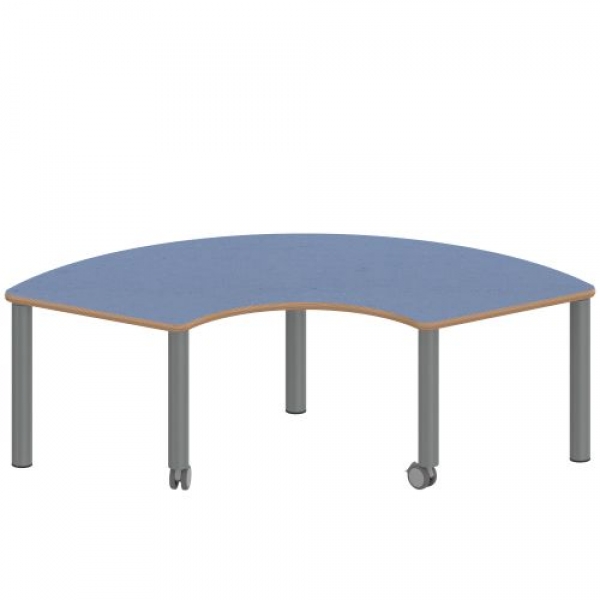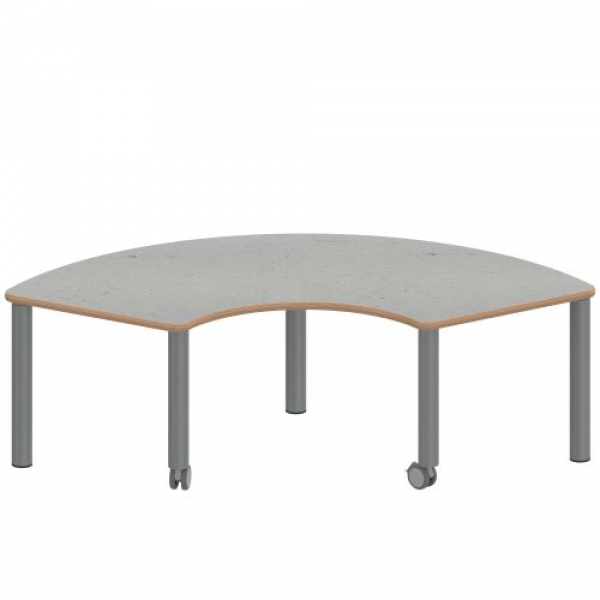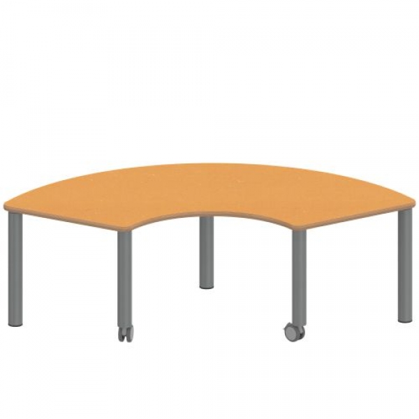 Drittelkreisförmige Tischplatte: 173 x 80 cm, Tischhöhe 41 cm, Tischbeine aus Stahlrohr Ø 60 mm. Sie besitzen eine pulverbeschichtete Oberfläche in RAL 9006. Der Tisch ist mit der Tischfußvariante ''fahrbar'' ausgestattet. Der Drittelkreis-Tisch mit dem Außendurchmesser 200 cm und Innen-Ø 80 cm steht auf 5 Beinen. Für die Planung von Stellkombinationen: die 2 geraden Anstellseiten sind je 60 cm lang.