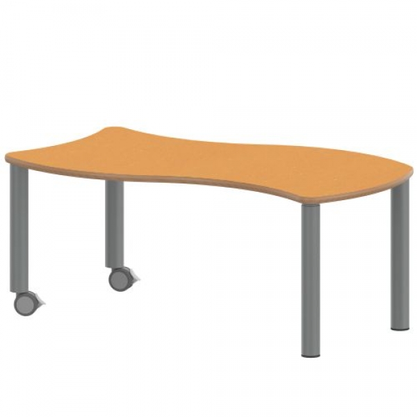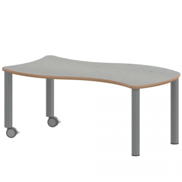 Rechteckige Wellen-Tischplatte: 120 x 60 cm (Systemmaß) / Stellfläche 126,7 x 76 cm, Tischhöhe 41 cm, Tischbeine aus Stahlrohr Ø 60 mm. Sie besitzen eine pulverbeschichtete Oberfläche in RAL 9006. Der Tisch ist mit der Tischfußvariante ''fahrbar'' ausgestattet.