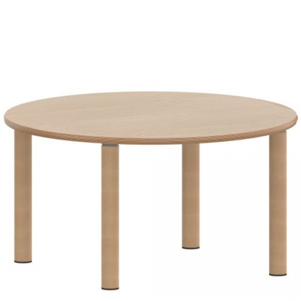 Kreisrunde Tischplatte: Ø 100 cm, Tischhöhe 41 cm, Tischbeine aus Massivholz Ø 60 mm. Die Holzoberfläche ist mehrfach lackiert. Der Tisch ist mit der Tischfußvariante ''Stellfuß'' ausgestattet.