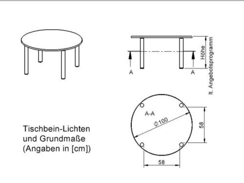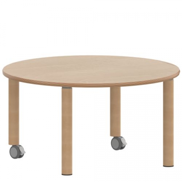 Kreisrunde Tischplatte: Ø 100 cm, Tischhöhe 41 cm, Tischbeine aus Massivholz Ø 60 mm. Die Holzoberfläche ist mehrfach lackiert. Der Tisch ist mit der Tischfußvariante ''fahrbar'' ausgestattet.