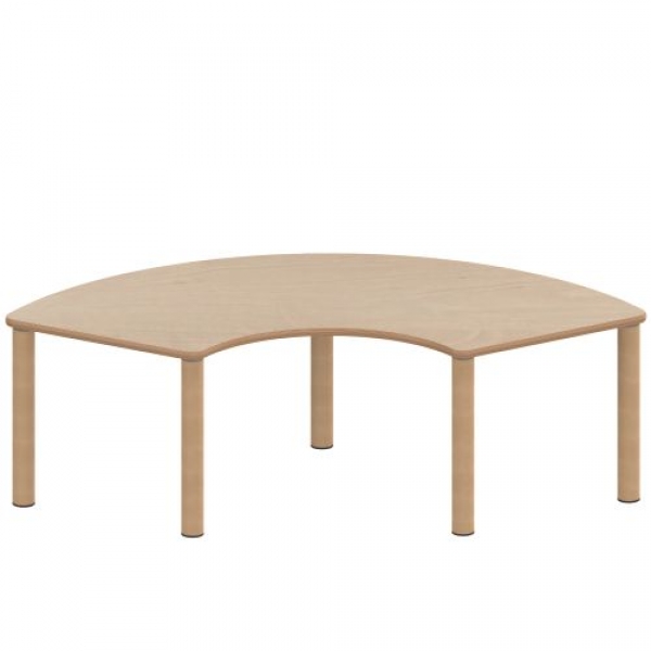 Drittelkreisförmige Tischplatte: 173 x 80 cm, Tischhöhe 41 cm, Tischbeine aus Massivholz Ø 60 mm. Die Holzoberfläche ist mehrfach lackiert. Der Tisch ist mit der Tischfußvariante ''Stellfuß'' ausgestattet. Der Drittelkreis-Tisch mit dem Außendurchmesser 200 cm und Innen-Ø 80 cm steht auf 5 Beinen. Für die Planung von Stellkombinationen: die 2 geraden Anstellseiten sind je 60 cm lang.