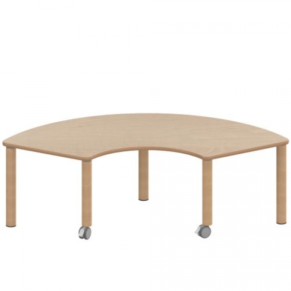 Drittelkreisförmige Tischplatte: 173 x 80 cm, Tischhöhe 41 cm, Tischbeine aus Massivholz Ø 60 mm. Die Holzoberfläche ist mehrfach lackiert. Der Tisch ist mit der Tischfußvariante ''fahrbar'' ausgestattet. Der Drittelkreis-Tisch mit dem Außendurchmesser 200 cm und Innen-Ø 80 cm steht auf 5 Beinen. Für die Planung von Stellkombinationen: die 2 geraden Anstellseiten sind je 60 cm lang.