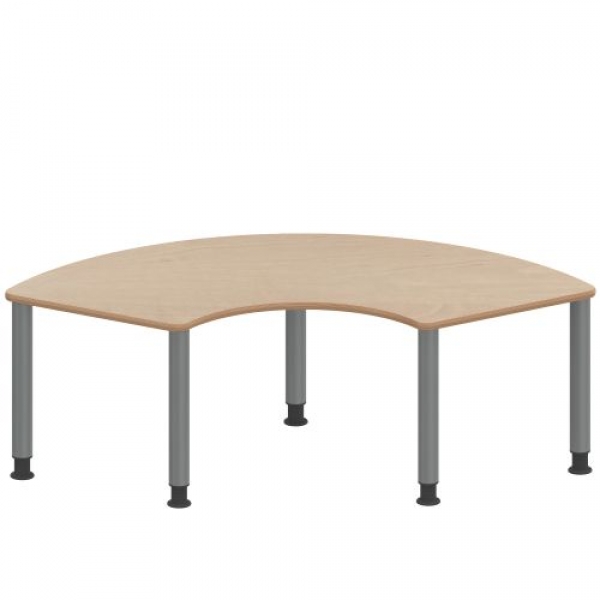 Drittelkreisförmige Tischplatte: 173 x 80 cm, Tischhöhe 41 cm, Tischbeine aus Stahlrohr Ø 60 mm. Sie besitzen eine pulverbeschichtete Oberfläche in RAL 9006. Der Tisch ist mit der Tischfußvariante ''manuell höheneinstellbar bis +14 cm '' ausgestattet. Der Drittelkreis-Tisch mit dem Außendurchmesser 200 cm und Innen-Ø 80 cm steht auf 5 Beinen. Für die Planung von Stellkombinationen: die 2 geraden Anstellseiten sind je 60 cm lang.