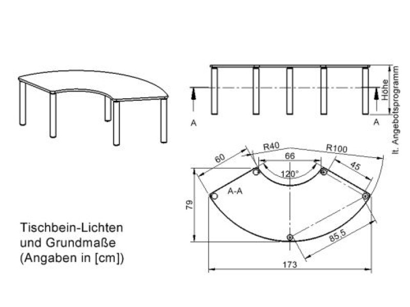 Drittelkreisförmige Tischplatte: 173 x 80 cm, Tischhöhe 41 cm, Tischbeine aus Stahlrohr Ø 60 mm. Sie besitzen eine pulverbeschichtete Oberfläche in RAL 9006. Der Tisch ist mit der Tischfußvariante ''fahrbar'' ausgestattet. Der Drittelkreis-Tisch mit dem Außendurchmesser 200 cm und Innen-Ø 80 cm steht auf 5 Beinen. Für die Planung von Stellkombinationen: die 2 geraden Anstellseiten sind je 60 cm lang.