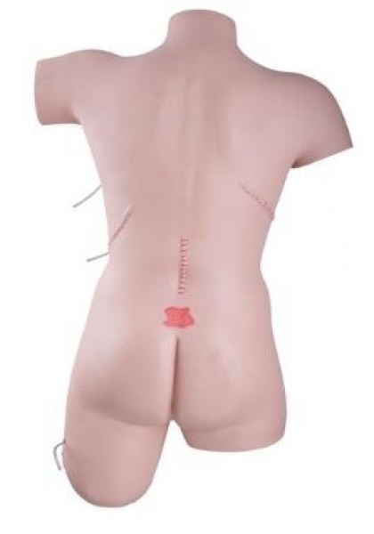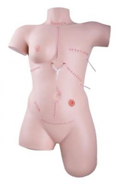 Die folgenden Wunden und Drainagesysteme als Resultat von chirurgischen Eingriffen und Verletzungen sind auf realistische Art an dem Torso dargestellt: