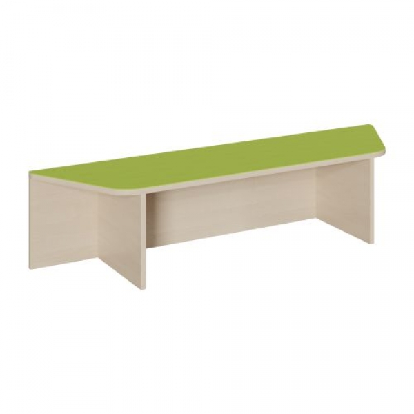 Das interessante Trapez-Podest besitzt an beiden Enden 60°-Schrägen, sodass mehrere Podeste dieser Bauform ohne weiteres einander zugewandt im Winkel gestellt werden können; 6 Trapezpodeste ergeben ein komplettes Sechseck. Jedes Trapezpodest besitzt eine mittige Rollkastengarage. Die auskragend überstehenden Enden der Oberplatte sind großzügig gerundet, sodaß sich jegliches Verletzungsrisiko auf ein Minimum reduziert. Die 2 mm - ABS Sicherheitskanten an der Podestplatte aus 19 mm E 1-Feinspanplatte gewährleisten beanspruchungsfähige Bauteilkanten, die den täglichen Beanspruchungen ohne Weiteres standhalten. Die Linoleumoberfläche stellt eine strapazierfähige und pflegeleichte Oberfläche dar, sie ist aus mehreren fröhlichen Farben wählbar. Mit dem Material Linoleum steht eine geräuschdämmende, kratzfeste, abwisch- und desinfizierbare Oberfläche zur Verfügung. Das Dekor des Podestkorpus wird ebenfalls in mehreren Varianten angeboten: bitte wählen Sie bei der Bestellung!
