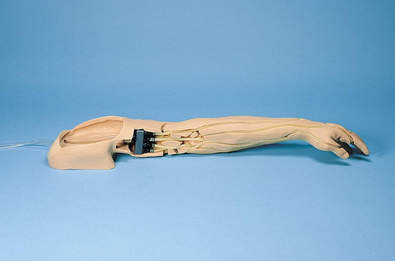 Venen und Haut können ausgewechselt werden, der Arm ist beweglich, so dass auch die richtige Manipulation während der Injektion geübt werden kann.