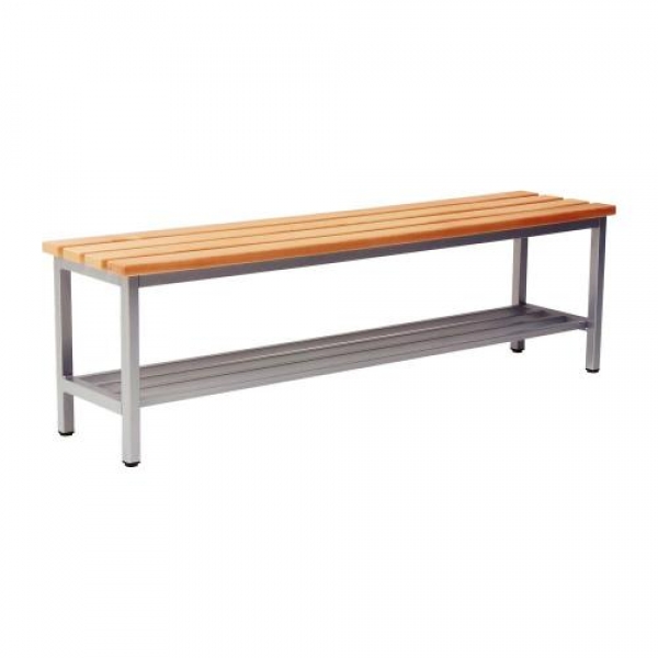 Umkleidebank mit Schuhrost. Die Sitz- und Rückenlehnenflächen sind aus 25 mm starker melaminharzbeschichteter E1- Feinspanplatte mit ABS- Umleimer im Dekor nach Wahl gefertig.