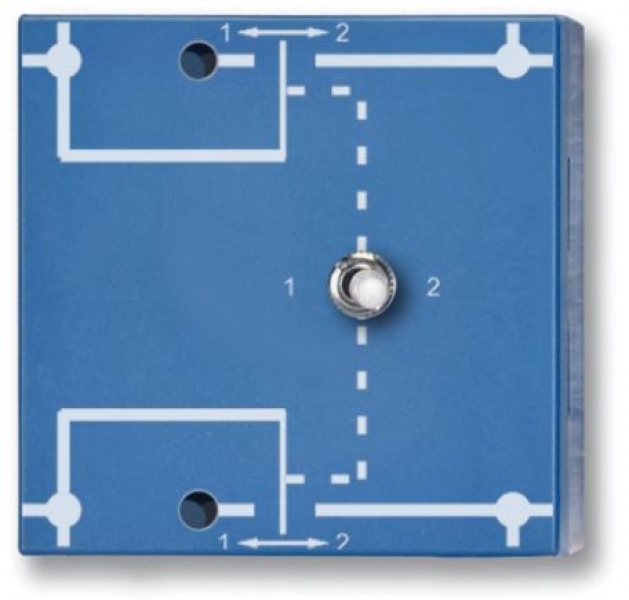 Mechanischer Kippschalter auf quadratischem, mit dem passenden Schaltungssymbol bedrucktem Steckergehäuse.