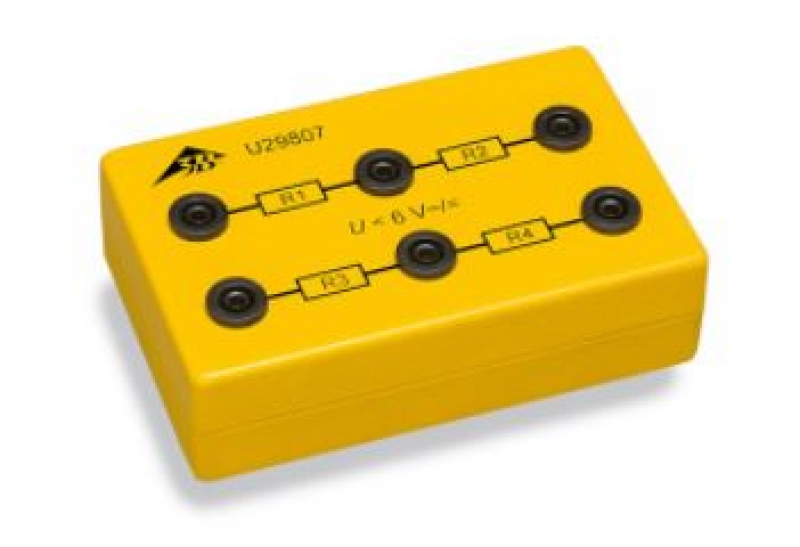In elektrisch sicherer Box mit Anschlussbuchsen für Sicherheitsexperimentierkabel und aufgedruckten Schaltkreissymbolen.