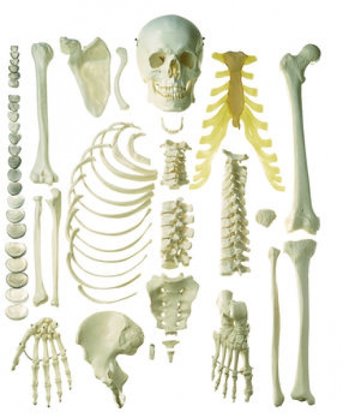 Naturabguß, aus SOMSO-Plast®. Mit Ausnahme des Schädels (mit abnehmbarem Schädeldach und Unterkiefer), der Hand und des Fußes alle Knochen unmontiert. In Plastikbeuteln im Versandkarton.