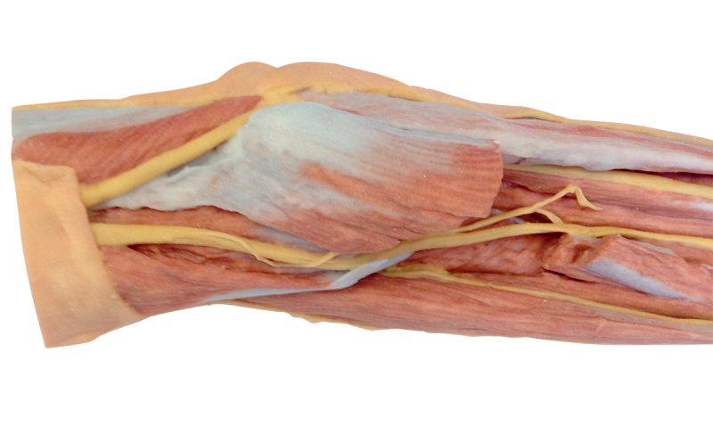 Dieses 3D-gedruckte Präparat zeigt eine sowohl oberflächliche als auch tiefe Präparation der anterioren Seite eines rechten distalen Arms, Unterarms und Hand.