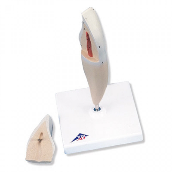 Zahnmodellserie, 5 Modelle Die komplette Serie besteht aus 5 Zahnmodellen eines Erwachsenen, einzeln auf abnehmbarem Stativ montiert. Unterer Eckzahn, 2-teilig (Artikelnummer: 1000241) Unterer zweiwurzeliger Molar mit Karies, 2-teilig (Artikelnummer: 1000243) Oberer dreiwurzeliger Molar, 3-teilig (Artikelnummer: 1017580) Unterer Schneidezahn, 2-teilig (Artikelnummer: 1000240) Unterer einwurzeliger Prämolar (Artikelnummer: 1000242)