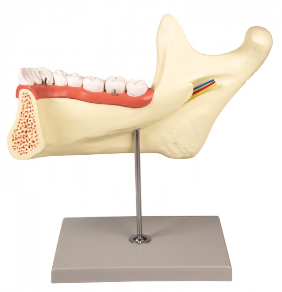 Dieses sechsteilige Modell in dreifacher Lebensgröße zeigt alle Charakteristika der Mandibula eines Erwachsenen auch in den kleineren Details. Ein Teil des Unterkiefers kann abgenommen