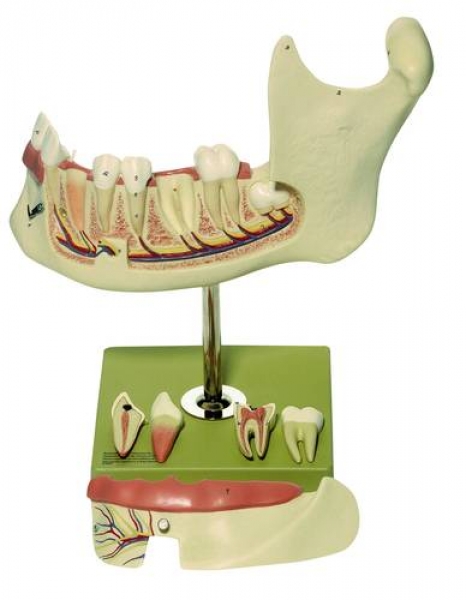 wie ES 4, jedoch zeigt der herausnehmbare Eckzahn eine Wurzelhaut-entzündung und Karieserkrankung im fortgeschrittenen Stadium. Am 1. Molar ist eine Zahnmarkentzündung dargestellt. 6teilig, auf Stativ mit grünem Sockel.