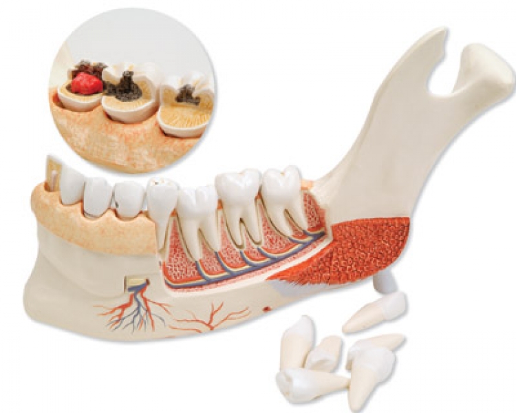 Modell der Unterkieferhälfte mit 8 kariösen Zähnen, insgesamt 19 Teile. Die vordere Knochenpartie ist zur Ansicht und Entnahme der einzelnen Zähne abnehmbar. Zum Studium der inneren Zahnstruktur ist ein Schneidezahn längs geschnitten. Detailliert dargestellt sind außerdem Nerven, Blutgefäße, Muskelansätze, Unterzungendrüse und Unterkieferdrüse. Die erkrankten Zähne repräsentieren verschiedene Stadien von Karies in der ganzen Bandbreite von leicht behandelbarem Kariesbefall bis hin zu einer fortgeschrittenen Zerstörung eines Backenzahns mit freigelegter Wurzel. Mit diesem Modell können Sie eindrucksvoll die Anwendung und Notwendigkeit der richtigen Zahnputztechnik veranschaulichen.