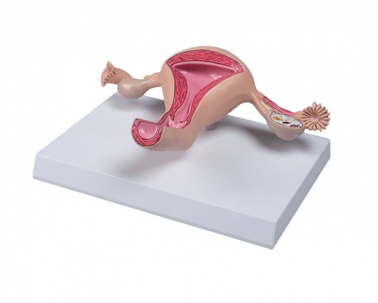 Dieses lebensgroße Modell zeigt sehr detailgetreu den Aufbau der weiblichen Geschlechtsorgane. Es ist 4-teilig und ist entlang der medianen Sagittallinie eröffnet. Herausnehmbar sind zwei obere Uterushälften und beide Hälften des weiblichen Fortpflanzungsapparats, die seinen inneren Aufbau zeigen.