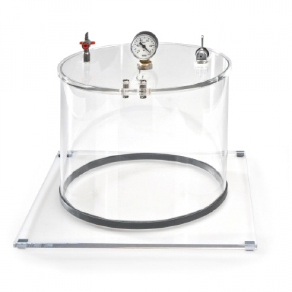 Bestehend aus Bodenplatte und Vakuumzylinder mit Belüftungsventil, Manometer, Absaughahn, Kontaktdurchführungen und Gummiring.