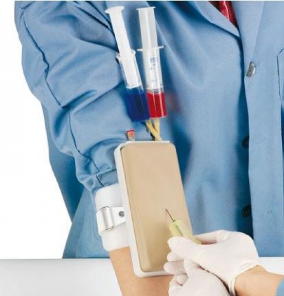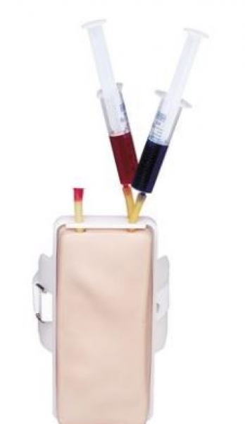 Dieser i.v.-Trainer lässt sich ganz einfach am Arm einer Person befestigen, so dass Venenpunktionsverfahren ganz einfach geübt werden können, einschließlich der Positionierung an einem lebenden Menschen, ohne dass die Risiken durch eine Punktion von lebendem Gewebe vorhanden sind.