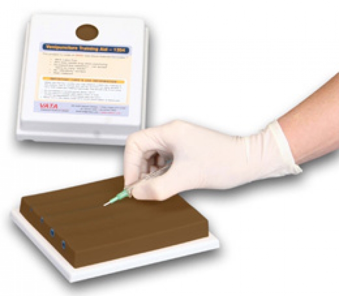 Der Venenpunktionstrainer mit zwei Venen besitzt zwei kaum erkennbare blaue Venen mit unterschiedlichem Innendurchmesser, die in gleicher Tiefe in einem halbtransparentem, gewebeähnlichem Material liegen.
