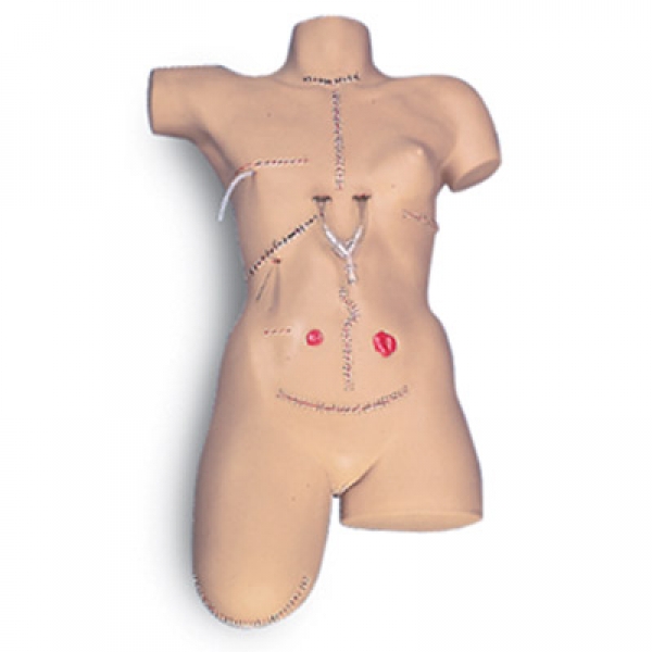 Dieser Simulator besteht aus einem weiblichen Oberkörper mit einer elastischen und naturgetreuen Haut mit realistischer Reaktion auf Pflaster und alle Verbandformen.
