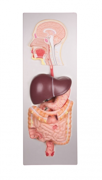 Das Anschauungsmodell in Lebensgröße zeigt den gesamten Verdauungstrakt von der Mundhöhle bis zum Rektum. Mundhöhle, Pharynx und der oberste Ösophagusabschnitt sind auf der medialen Sagittalebene eröffnet. Die Leber ist zusammen mit der Gallenblase dargestellt und abnehmbar. Die abnehmbare Bauchspeicheldrüse und Zwölffingerdarm sind aufgeschnitten, um die inneren Strukturen erkennbar zu machen. Der Magen ist abnehmbar und in zwei Teile zerlegbar, Teile von Dickdarm, Blinddarm, Dünndarm und Rektum sind eröffnet, so dass die inneren Strukturen betrachtet werden können. Modell auf Grundbrett montiert.