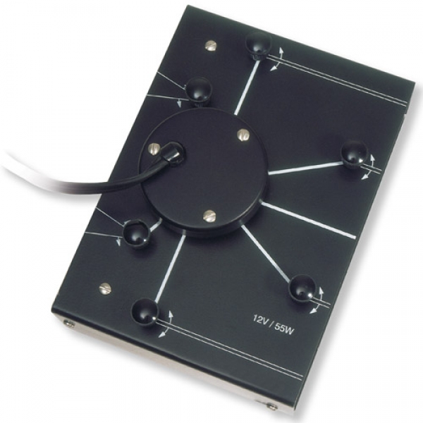 Für Versuche zur Reflexion, Brechung und Linsen. 1 bis 2 divergente Lichtstrahlen, deren Überlappungsbereich über Spiegel eingestellt werden kann, stehen auf der Rückseite der Vielstrahlleuchte für Versuche zum Schattenwurf und zur Farbenlehre zur Verfügung.
