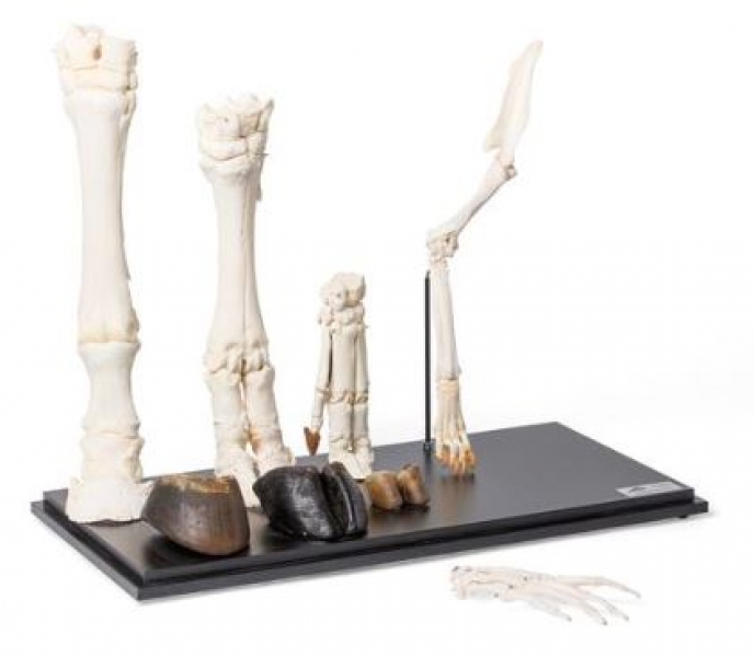 Enthalten sind vier echte Knochenpräparate: Vorderbein vom Hund und jeweils ein Vorderfuß von Pferd, Rind und Schwein, sowie ein Naturabguss aus Kunststoff einer menschlichen Hand.